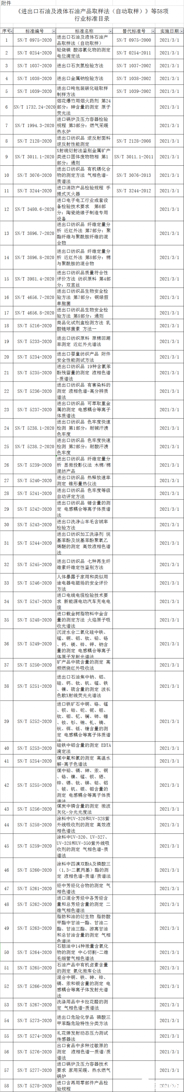 現(xiàn)發(fā)布《進出口石油及液體石油產(chǎn)品取樣法(自動取樣)》等58項行業(yè)標(biāo)準(zhǔn)(目錄見附件)?!哆M出口石油及液體石油產(chǎn)品取樣法(自動取樣)》(SN/T 0975—2000)等9項被代替標(biāo)準(zhǔn)自新標(biāo)準(zhǔn)實施之日起廢止。