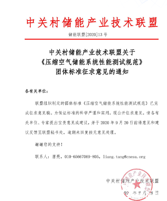 中關(guān)村儲(chǔ)能產(chǎn)業(yè)技術(shù)聯(lián)盟關(guān)于《壓縮空氣儲(chǔ)能系統(tǒng)性能測(cè)試規(guī)范》團(tuán)體標(biāo)準(zhǔn)征求意見的通知