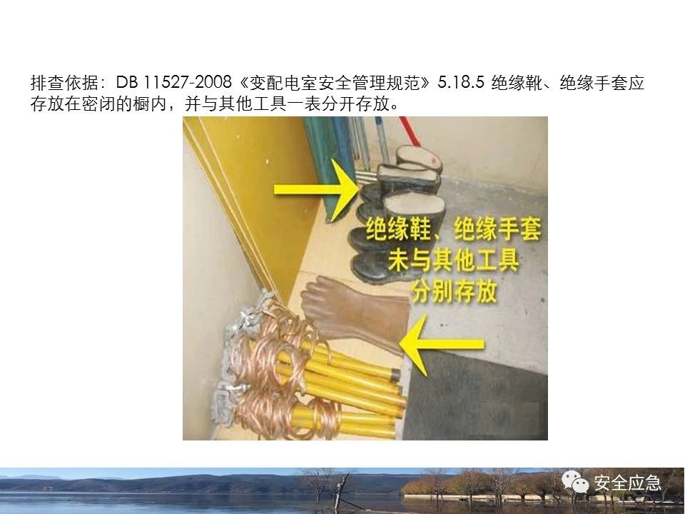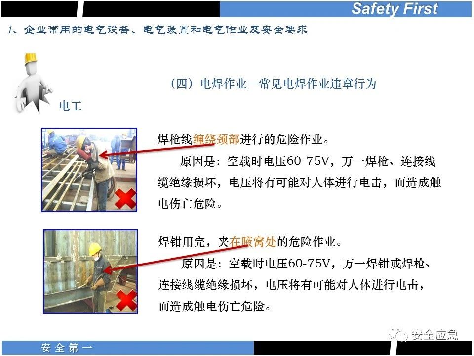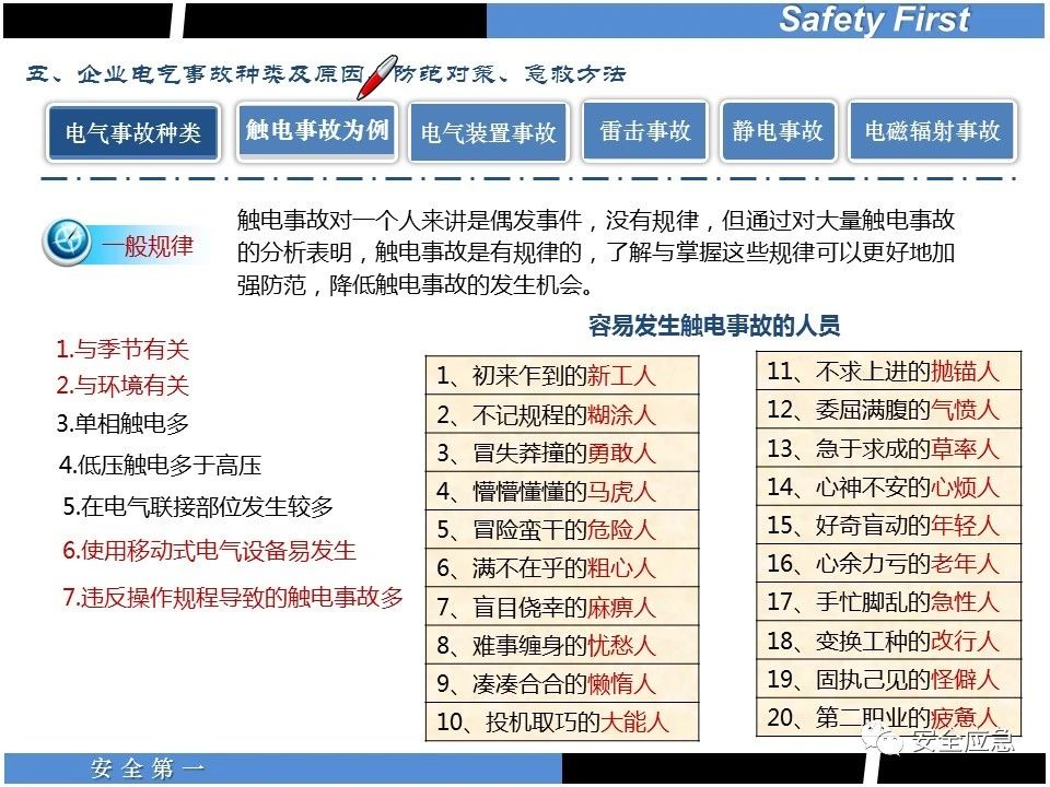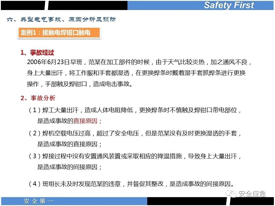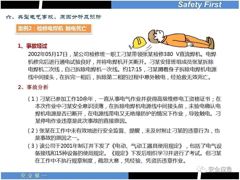 案例73 事故案例73:某35變電站準(zhǔn)備10kV避雷器試驗(yàn)。作業(yè)人員會(huì)同運(yùn)行人員準(zhǔn)備查看設(shè)備實(shí)際情況,拆卸10kV開關(guān)柜背板螺栓,打開了柜門上的電磁鎖,并打開了后柜門后,作業(yè)人員探頭進(jìn)入開關(guān)柜內(nèi)時(shí),對(duì)開關(guān)柜放電。 其它案例見17、18、19、20、21、22、23、50、52。 (27)多組人員組織混亂 案例74 事故案例74:某單位開展500kV線路停電檢修和地線融冰試驗(yàn)。1名工作人員不聽他人勸阻,登塔拆除引流線。隨后開展地線融冰試驗(yàn),該工作人員觸電死亡。 其它案例見45、46、47、48。 (28)交底不認(rèn)真 案例75 事故案例75:某工作負(fù)責(zé)人帶領(lǐng)兩名工作人員準(zhǔn)備在10kV線路裝設(shè)接地線。工作前,工作負(fù)責(zé)人沒有進(jìn)行班前(后)會(huì),沒有分配工作任務(wù),也沒有交代安全注意事項(xiàng),另外兩人也沒有主動(dòng)詢問,相互提醒,導(dǎo)致工作負(fù)責(zé)人無監(jiān)護(hù)誤登運(yùn)行線路,造成觸電。 其它案例見32。 (29)監(jiān)護(hù)不到位 l 單人工作無監(jiān)護(hù) 事故案例:36。 l 監(jiān)護(hù)人參與工作 事故案例:11。 l 監(jiān)護(hù)不認(rèn)真,或默許違章行為 事故案例:67。 (30)人員、工作安排不恰當(dāng) 案例76 事故案例76:某供電所安排不具備單獨(dú)工作資格和能力的新入廠員工上桿進(jìn)行配變?cè)O(shè)備搶修工作,由于安全距離不夠,員工經(jīng)驗(yàn)不足,監(jiān)護(hù)不到位,導(dǎo)致觸電。 案例77 事故案例77:某高壓試驗(yàn)班開展定檢預(yù)試作業(yè)。工作負(fù)責(zé)人與工作人員在抄錄放電計(jì)數(shù)器銘牌,另一名剛參加工作不久的工作人員拿著自制試驗(yàn)線插入移動(dòng)電源盤插座內(nèi),然后,用左、右手分別拿住兩個(gè)鱷魚夾準(zhǔn)備對(duì)放電器搭接做試驗(yàn),左、右手習(xí)慣性的分別握住了兩個(gè)鱷魚夾的導(dǎo)體部分,此時(shí)電流通過人體,漏電保護(hù)器沒有動(dòng)作,觸電死亡。 (31)單人作業(yè) l 野外單人巡線、勘察 案例78 事故案例78:某單位開展線路巡視時(shí),單人作業(yè),在被告知“巡視完N58塔后切勿過江,要沿原路返回”的情況下,仍然獨(dú)自一人違規(guī)游泳過江,溺水身亡。 案例79 事故案例79:某單位野外勘察時(shí),某工作人員在未告知工作負(fù)責(zé)人的情況下,獨(dú)自一人返回車輛所在地,途中墜落懸崖暈倒,受輕傷并失蹤12小時(shí)。 附件:最全面的電氣安全培訓(xùn),實(shí)用!