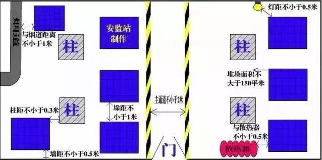 儲(chǔ)存物品與風(fēng)管、供暖管道、散熱器的距離不應(yīng)小于0.5米。與供暖機(jī)組、風(fēng)管爐、煙道之間的距離在各個(gè)方向上都不應(yīng)小于1米?!秱}儲(chǔ)場所消防安全管理通則》(GA1131-2014)6.14