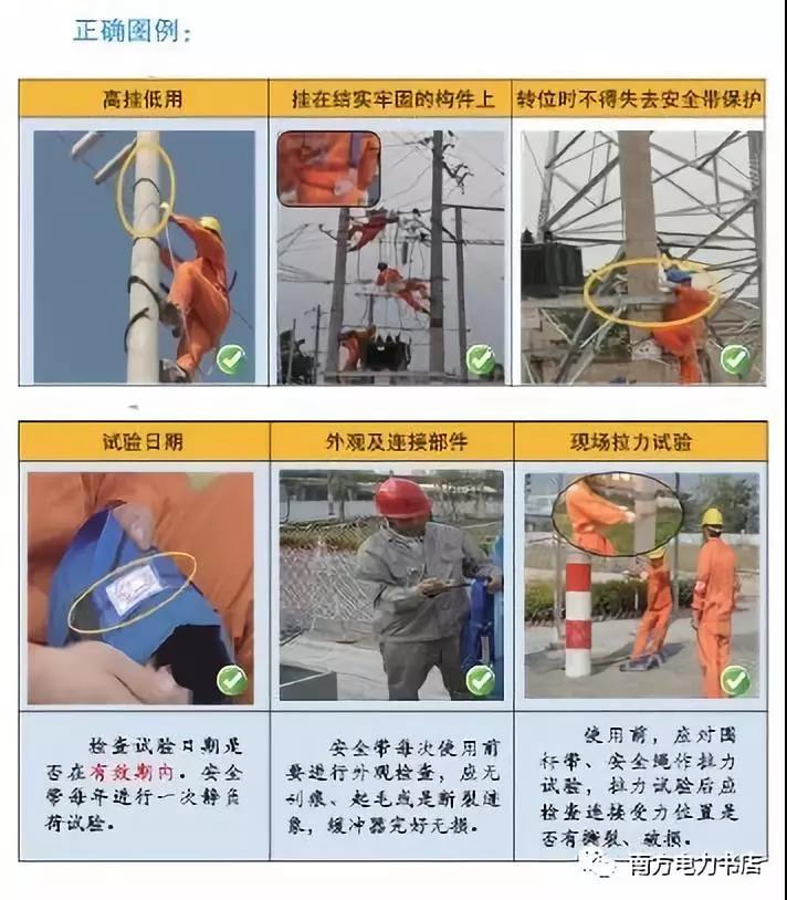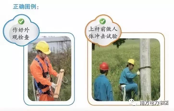 (1)登桿前,使用人應(yīng)對(duì)腳扣做人體沖擊檢驗(yàn),方法是將腳扣系于電桿離地0.5m左右處,借人體重量猛力向下蹬踩,腳扣及腳套不應(yīng)有變形及任何損壞后方可使用。