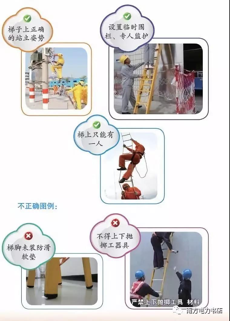 (3)硬質(zhì)梯子的橫檔應(yīng)嵌在支柱上, 梯階的距離不應(yīng)大于40cm,并在距梯頂1m處設(shè)限高標(biāo)志??吭诠茏由稀?dǎo)線上使用梯子時(shí),其上端需用掛鉤掛住或用繩索綁牢;伸縮梯調(diào)整長(zhǎng)度后,要檢查防下滑鐵卡是否到位起作用,并系好防滑繩,梯角沒(méi)有防滑裝置或防滑裝置破損、折梯沒(méi)有限制開(kāi)度的撐桿或拉鏈的嚴(yán)禁使用。