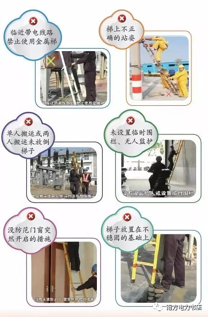 (6)在部分停電或不停電的作業(yè)環(huán)境下,應(yīng)使用絕緣梯。在帶電設(shè)備區(qū)域中,距離運(yùn)行設(shè)備較近時(shí),嚴(yán)禁使用金屬梯。在戶外變電站和高壓室內(nèi)搬動(dòng)梯子、管子等長(zhǎng)物,應(yīng)兩人放倒搬運(yùn),并與帶電部分保持足夠的安全距離,以免人身觸電氣設(shè)備發(fā)生事故。