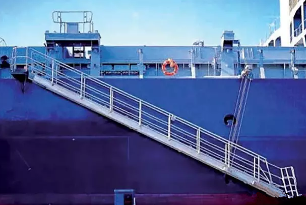 根據(jù)新生效的GB/T11701-2021《船用舷梯的基本規(guī)定》(3月1日起施行),舷梯主要分為兩類: (1)旋轉(zhuǎn)平臺式舷梯 單節(jié)舷梯、多節(jié)舷梯或伸縮舷梯的結(jié)構(gòu)與上面的旋轉(zhuǎn)平臺鉸接,可在船與登梯底面之間改變方向和傾斜角度。舷梯可用鋼絲繩或鏈從較低的(各)懸掛點掛住,或用固定在舷梯底部滾柱支持。 (2)固定平臺式舷梯 單節(jié)舷梯、多節(jié)舷梯或伸縮舷梯的結(jié)構(gòu)與上面的固定平臺鉸接,可在船和登梯底面之間改變傾斜角度。舷梯用鋼絲繩或鏈從較低的(各)懸掛點掛住,單獨使用的引航員舷梯采用此固定平臺式舷梯。 根據(jù)SOLAS第II-1章第3-9條款,凡是2010年1月1日及以后建造的船舶,必須在船上安裝經(jīng)認可的登/離船設施,以備在港口或港口相關操作時使用。 該登/離船設施必須根據(jù)MSC.1/Circ.1331通函的要求進行建造、測試、安裝及維護,主要包括以下八點要求: (1)登/離船設施應遠離工作區(qū)域以及貨物或其它物體懸掛吊裝時可能通過上方的區(qū)域,該登/離船設施的目的和使用方式與引水員登 / 離船裝置是不同的; (2)應提供足夠的照明,以照亮登/離船設施、甲板上人員登/離船和裝置控制的位置; (3)當?shù)?離船裝置在使用時,在其附近應備有一只帶有自亮浮燈和救生浮索的救生圈(注意這里是要求一只救生圈既配備有自亮浮燈又配備有救生浮索,并且處于隨時可用狀態(tài)); (4)每部舷梯應具有在其最大操作傾斜角時,下平臺在最輕載水線以上不大于600mm的高度; (5)在每部舷梯或跳板梯的兩端應設置一塊標記牌,以清楚顯示安全操作和負荷限制,包括最大和最小允許設計傾斜角、設計負荷、最大底端板負荷等,如果最大操作負荷小于設計負荷,則最大操作負荷也應顯示在標記牌上; (6)跳板梯使用時安放水平傾斜角不應大于30度和舷梯使用時水平傾斜角不應大于55度; (7)在人員從登/離船設施或船舶與碼頭之間可能墜落的舷梯下應安放安全網(wǎng); (8)正確設置舷梯下平臺的安全插銷。 收放前:應對升降機械、鋼絲繩、滑車轉(zhuǎn)盤平臺支架等進行檢查,確認設備完好,鋼絲、卷筒、吊梁無障礙后方可作業(yè)。 收放過程中: (1)船靠離碼頭收放舷梯過程中,應有專人指揮,作業(yè)人員默契配合。在浮動的梯子上進行收起、安裝欄桿、護繩作業(yè)時,應先檢查平臺支架是否已可靠支好,并使用止蕩索,上舷梯操作人員必須系好安全帶,穿好救生衣。 (2)舷梯落岸下踏板應避開障礙物,安放平穩(wěn),嚴禁扭曲。吊梁、鏈條要注意絞高或安放妥當,以免碰頭和妨礙上下船。 (3)由于潮夕、裝卸貨、碼頭環(huán)境等因素影響,舷梯不能放置碼頭時,要注意隨時調(diào)整舷梯高度。當舷梯下踏板離碼頭較高較遠時,不允許勉強上下。梯口值班人員負責調(diào)整舷梯和提醒上下人員注意安全,必要時應按規(guī)定加裝橋梯。 (4)由于漲落潮、移泊等原因需要松緊纜繩時,應絞起舷梯,收起橋梯,或?qū)H丝春锰菘诮谷藛T上下。在無法使用舷梯時,要正確地搭設橋梯,必須綁扎牢固、裝妥扶手、掛好安全網(wǎng)后人員方可上下。禁止從船舷直接跳上碼頭,或從碼頭直接跳上船。 (5)舷梯、橋梯必須按規(guī)定張掛安全網(wǎng)。舷梯、橋梯處應有防墜落、防滑等安全指示標志。舷梯、橋梯的扶手、扶繩、階梯必須保持清爽、干凈、牢固,便于上下人員抓牢、踏實。 (6)禁止用舷梯吊運物品,禁止超載。