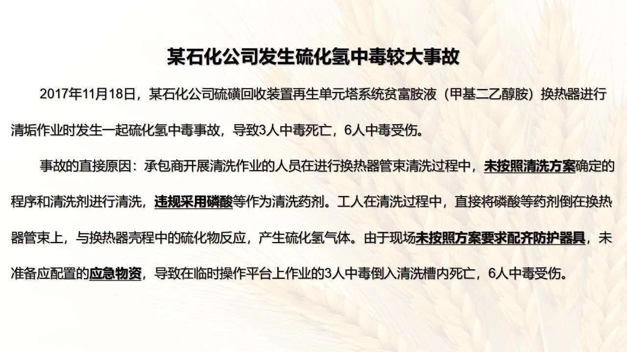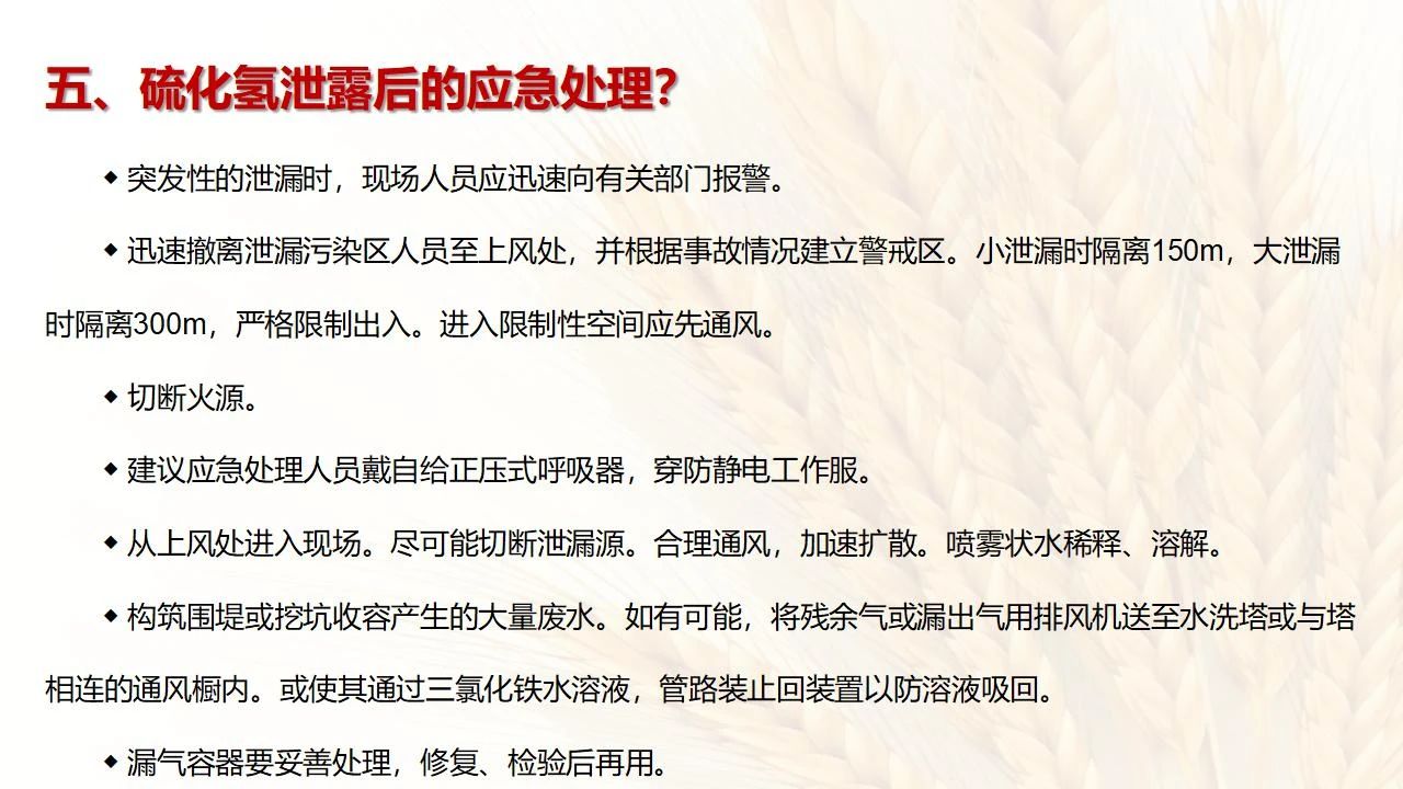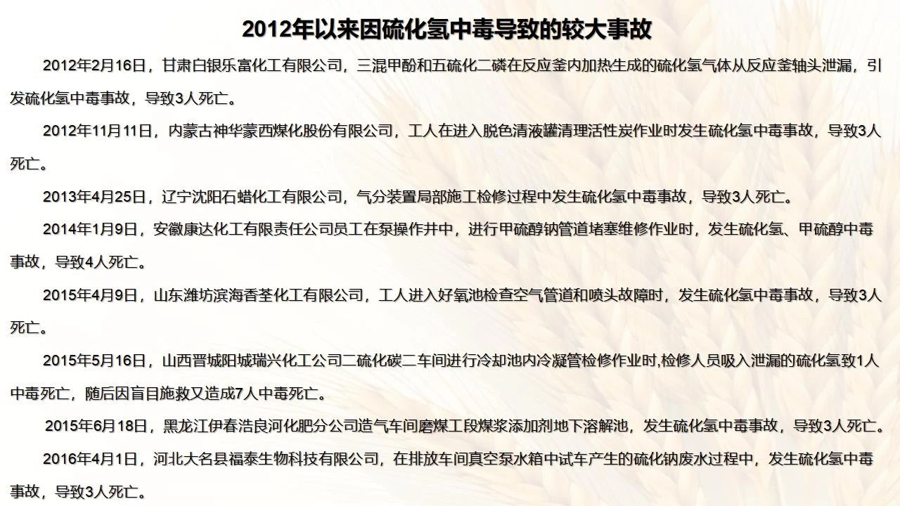 1預(yù)防措施 涉及硫化氫作業(yè)活動(dòng),必須嚴(yán)格遵守《化學(xué)品生產(chǎn)單位特殊作業(yè)安全規(guī)范》(GB 30871-2014)及相關(guān)的規(guī)范、標(biāo)準(zhǔn)、制度,并特別注意以下幾點(diǎn): 1.產(chǎn)生硫化氫的生產(chǎn)設(shè)備應(yīng)盡量密閉,并設(shè)置自動(dòng)報(bào)警裝置(不能根據(jù)臭味來(lái)判斷危險(xiǎn)場(chǎng)所硫化氫的濃度,硫化氫達(dá)到一定濃度時(shí)會(huì)導(dǎo)致嗅覺(jué)麻痹)。 2.對(duì)含有硫化氫的廢水、廢氣、廢渣,要進(jìn)行凈化處理,達(dá)到排放標(biāo)準(zhǔn)后方可排放。 3.進(jìn)入可能存在硫化氫的密閉容器、坑、窯、地溝等工作場(chǎng)所,應(yīng)首先測(cè)定該場(chǎng)所硫化氫濃度,采取通風(fēng)排毒措施,確認(rèn)安全后方可操作。作業(yè)過(guò)程中應(yīng)連續(xù)測(cè)定硫化氫濃度。 4.操作時(shí)做好個(gè)人防護(hù)措施,配好防毒用具(防毒面具一般為逃生自救用),作業(yè)工人腰間縛以救護(hù)帶或繩子。做好互保,要2人以上人員在場(chǎng)。 5.患有肝炎、腎病、氣管炎的人員不得從事接觸硫化氫作業(yè)。 6.加強(qiáng)員工有關(guān)專(zhuān)業(yè)安全知識(shí)技能的培訓(xùn),提高自我防護(hù)意識(shí)和能力。 2作業(yè)有關(guān)注意事項(xiàng) (1)檢查采樣器是否完好,采用密閉取樣; (2)佩戴便攜式有毒有害(硫化氫)氣體檢測(cè)儀、適用的防毒用具,站在上風(fēng)向,并有專(zhuān)人監(jiān)護(hù); (3)采樣過(guò)程中手閥應(yīng)慢慢打開(kāi),不要用扳手敲打閥門(mén)。 (1)佩戴便攜式有毒有害(硫化氫)氣體檢測(cè)儀、適用的防毒用具,站在上風(fēng)向,并有專(zhuān)人監(jiān)護(hù); (2)切水閥與切水口應(yīng)有一定距離; (3)脫出的酸性氣要用氫氧化鈣或氫氧化鈉溶液中和,并有隔離措施,防止過(guò)路行人中毒; (4)切水過(guò)程中人不能離開(kāi)現(xiàn)場(chǎng)。 需進(jìn)入設(shè)備、容器進(jìn)行檢修,應(yīng)經(jīng)過(guò)加盲板、吹掃、置換、采樣分析合格、辦理進(jìn)設(shè)備容器安全作業(yè)票后,才能進(jìn)入作業(yè)。但有些設(shè)備容器在檢修前,需進(jìn)人排除殘余的油泥、余渣,清理過(guò)程中會(huì)散發(fā)出硫化氫和油氣等有毒有害氣體,必須做好安全措施。以下七項(xiàng)為設(shè)備內(nèi)檢修作業(yè)步驟: (1)制定施工方案; (2)作業(yè)人員經(jīng)過(guò)安全技術(shù)培訓(xùn); (3)進(jìn)設(shè)備容器作業(yè)前,必須作好氣體采樣分析; (4)辦理進(jìn)入受限空間安全作業(yè)票; (5)佩戴防毒用具(空呼等),攜帶好安全帶(繩); (6)作業(yè)時(shí)間不宜過(guò)長(zhǎng),一般不超過(guò)30min; (7)施工過(guò)程須有專(zhuān)人監(jiān)護(hù),必要時(shí)應(yīng)有醫(yī)務(wù)人員在場(chǎng)。 (1)執(zhí)行進(jìn)入受限空間作業(yè)安全防護(hù)規(guī)定; (2)控制各種物料的切水排凝進(jìn)入下水道; (3)采用強(qiáng)制通風(fēng)或自然通風(fēng),保證氧含量為18%-21%,在富氧環(huán)境下不應(yīng)大于23.5%; (4)配帶防毒用具(空呼等); (5)攜帶好安全帶(繩); (6)進(jìn)入下水道內(nèi)作業(yè)井下要設(shè)專(zhuān)人監(jiān)護(hù),并與地面保持密切聯(lián)系。 (1)下油池清理前,必須用泵把污油、污水抽干凈,用高壓水沖洗置換; (2)采樣分析,根據(jù)測(cè)定結(jié)果確定施工方案和安全措施,辦理好進(jìn)入受限空間作業(yè)票。 (3)配備防毒用具(空呼等),有專(zhuān)人監(jiān)護(hù),必要時(shí)要攜好安全帶(繩); 設(shè)備、容器、管線存有硫化氫物料的堵漏、拆卸或安裝作業(yè)時(shí),必須做到: (1)嚴(yán)格控制帶壓作業(yè),應(yīng)把與其設(shè)備容器相通的閥門(mén)關(guān)死,安裝盲板,撤掉余壓;辦理相應(yīng)安全作業(yè)票; (2)佩戴適用的防毒用具(空呼等),有專(zhuān)人監(jiān)護(hù); (3)拆卸法蘭螺絲時(shí),在松動(dòng)之前,不要把螺絲全部拆開(kāi),嚴(yán)防有毒氣體大量沖出。 (1)平穩(wěn)操作,嚴(yán)防跑、冒、滴、漏; (2)裝置易泄漏或氣體易積聚的位置應(yīng)安裝固定式硫化氫檢測(cè)報(bào)警器; (3)加強(qiáng)機(jī)泵設(shè)備的維護(hù)管理,減少泄漏; (4)可能有泄漏的地方加強(qiáng)通風(fēng); (5)涉及硫化氫物料的容器、管線、閥門(mén)等要定期檢查更換; (6)發(fā)現(xiàn)硫化氫濃度高,要先報(bào)告,采取一定防護(hù)措施后,才能進(jìn)入現(xiàn)場(chǎng)檢查和處理。 (1)嚴(yán)禁在進(jìn)、出油及調(diào)合過(guò)程中進(jìn)行人工檢尺、測(cè)溫及拆裝安全附件等作業(yè); (2)必要的檢查、切水,操作人員應(yīng)佩戴便攜式有毒有害(硫化氫)氣體檢測(cè)儀,站在上風(fēng)向,并有專(zhuān)人監(jiān)護(hù); (3)準(zhǔn)備好適合的防毒面具,以便急用。 涉及有可能存在產(chǎn)生(逸出、外泄)硫化氫或者殘存硫化氫的清洗作業(yè)時(shí),應(yīng)事先進(jìn)行風(fēng)險(xiǎn)辨識(shí)分析,并結(jié)合分析結(jié)果采取安全措施。