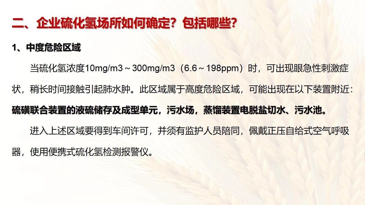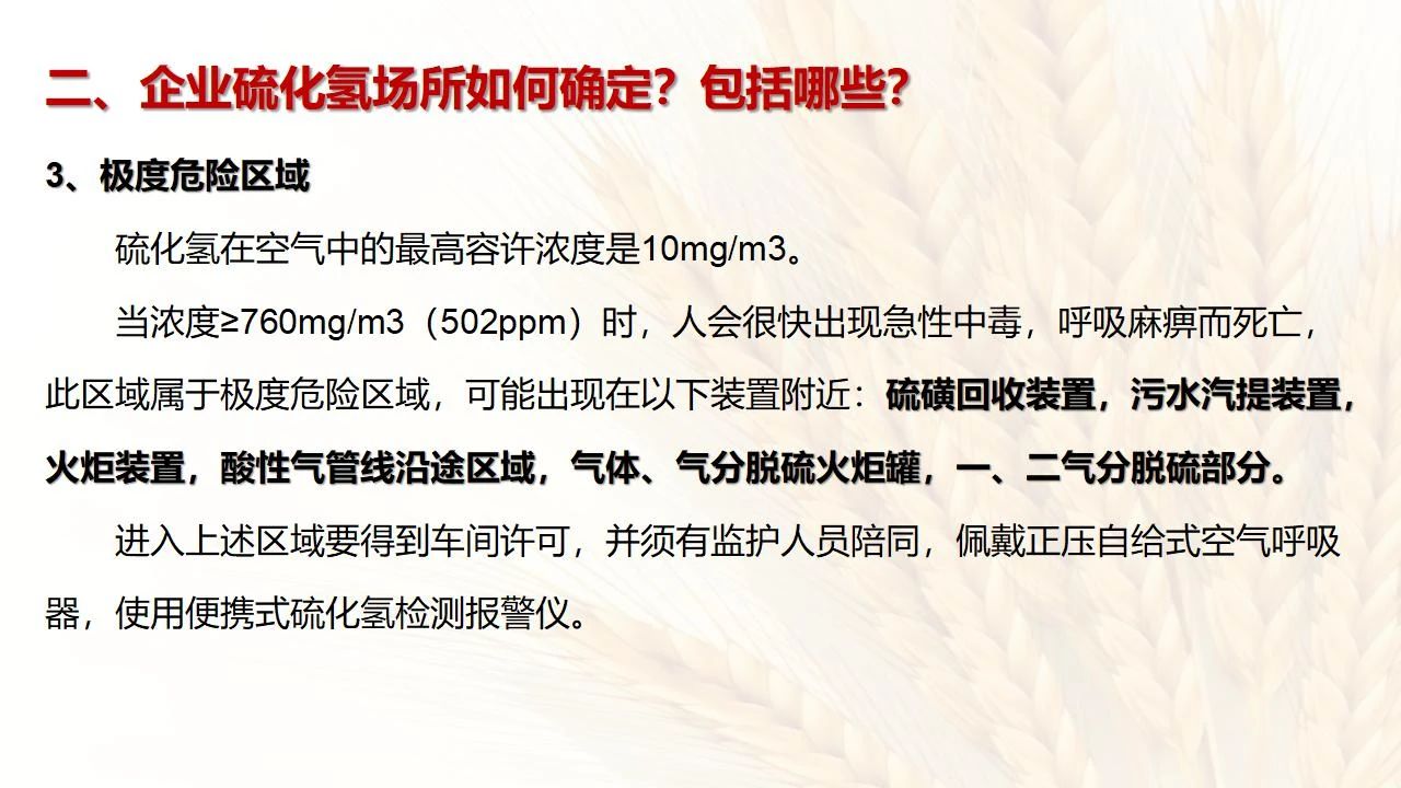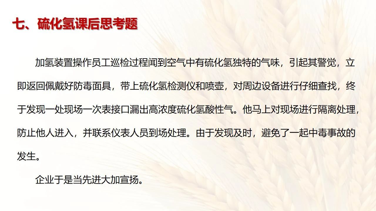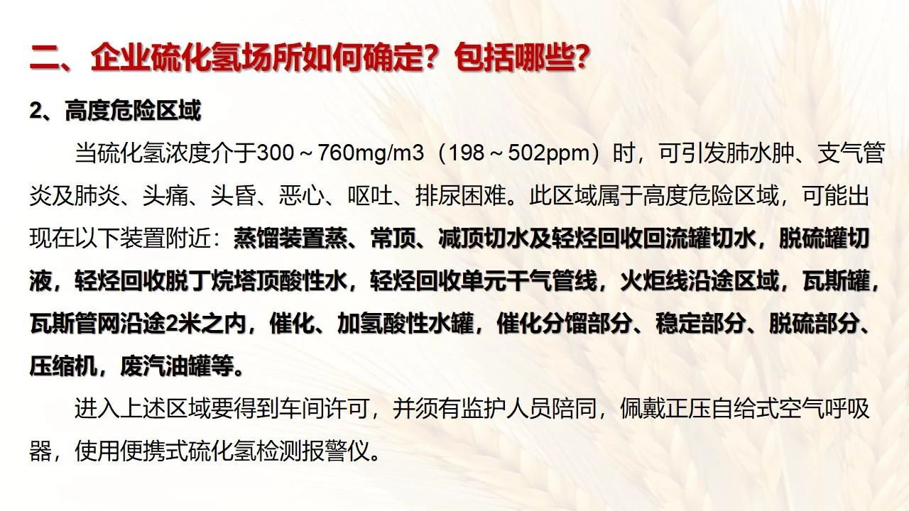1預(yù)防措施 涉及硫化氫作業(yè)活動(dòng),必須嚴(yán)格遵守《化學(xué)品生產(chǎn)單位特殊作業(yè)安全規(guī)范》(GB 30871-2014)及相關(guān)的規(guī)范、標(biāo)準(zhǔn)、制度,并特別注意以下幾點(diǎn): 1.產(chǎn)生硫化氫的生產(chǎn)設(shè)備應(yīng)盡量密閉,并設(shè)置自動(dòng)報(bào)警裝置(不能根據(jù)臭味來(lái)判斷危險(xiǎn)場(chǎng)所硫化氫的濃度,硫化氫達(dá)到一定濃度時(shí)會(huì)導(dǎo)致嗅覺(jué)麻痹)。 2.對(duì)含有硫化氫的廢水、廢氣、廢渣,要進(jìn)行凈化處理,達(dá)到排放標(biāo)準(zhǔn)后方可排放。 3.進(jìn)入可能存在硫化氫的密閉容器、坑、窯、地溝等工作場(chǎng)所,應(yīng)首先測(cè)定該場(chǎng)所硫化氫濃度,采取通風(fēng)排毒措施,確認(rèn)安全后方可操作。作業(yè)過(guò)程中應(yīng)連續(xù)測(cè)定硫化氫濃度。 4.操作時(shí)做好個(gè)人防護(hù)措施,配好防毒用具(防毒面具一般為逃生自救用),作業(yè)工人腰間縛以救護(hù)帶或繩子。做好互保,要2人以上人員在場(chǎng)。 5.患有肝炎、腎病、氣管炎的人員不得從事接觸硫化氫作業(yè)。 6.加強(qiáng)員工有關(guān)專(zhuān)業(yè)安全知識(shí)技能的培訓(xùn),提高自我防護(hù)意識(shí)和能力。 2作業(yè)有關(guān)注意事項(xiàng) (1)檢查采樣器是否完好,采用密閉取樣; (2)佩戴便攜式有毒有害(硫化氫)氣體檢測(cè)儀、適用的防毒用具,站在上風(fēng)向,并有專(zhuān)人監(jiān)護(hù); (3)采樣過(guò)程中手閥應(yīng)慢慢打開(kāi),不要用扳手敲打閥門(mén)。 (1)佩戴便攜式有毒有害(硫化氫)氣體檢測(cè)儀、適用的防毒用具,站在上風(fēng)向,并有專(zhuān)人監(jiān)護(hù); (2)切水閥與切水口應(yīng)有一定距離; (3)脫出的酸性氣要用氫氧化鈣或氫氧化鈉溶液中和,并有隔離措施,防止過(guò)路行人中毒; (4)切水過(guò)程中人不能離開(kāi)現(xiàn)場(chǎng)。 需進(jìn)入設(shè)備、容器進(jìn)行檢修,應(yīng)經(jīng)過(guò)加盲板、吹掃、置換、采樣分析合格、辦理進(jìn)設(shè)備容器安全作業(yè)票后,才能進(jìn)入作業(yè)。但有些設(shè)備容器在檢修前,需進(jìn)人排除殘余的油泥、余渣,清理過(guò)程中會(huì)散發(fā)出硫化氫和油氣等有毒有害氣體,必須做好安全措施。以下七項(xiàng)為設(shè)備內(nèi)檢修作業(yè)步驟: (1)制定施工方案; (2)作業(yè)人員經(jīng)過(guò)安全技術(shù)培訓(xùn); (3)進(jìn)設(shè)備容器作業(yè)前,必須作好氣體采樣分析; (4)辦理進(jìn)入受限空間安全作業(yè)票; (5)佩戴防毒用具(空呼等),攜帶好安全帶(繩); (6)作業(yè)時(shí)間不宜過(guò)長(zhǎng),一般不超過(guò)30min; (7)施工過(guò)程須有專(zhuān)人監(jiān)護(hù),必要時(shí)應(yīng)有醫(yī)務(wù)人員在場(chǎng)。 (1)執(zhí)行進(jìn)入受限空間作業(yè)安全防護(hù)規(guī)定; (2)控制各種物料的切水排凝進(jìn)入下水道; (3)采用強(qiáng)制通風(fēng)或自然通風(fēng),保證氧含量為18%-21%,在富氧環(huán)境下不應(yīng)大于23.5%; (4)配帶防毒用具(空呼等); (5)攜帶好安全帶(繩); (6)進(jìn)入下水道內(nèi)作業(yè)井下要設(shè)專(zhuān)人監(jiān)護(hù),并與地面保持密切聯(lián)系。 (1)下油池清理前,必須用泵把污油、污水抽干凈,用高壓水沖洗置換; (2)采樣分析,根據(jù)測(cè)定結(jié)果確定施工方案和安全措施,辦理好進(jìn)入受限空間作業(yè)票。 (3)配備防毒用具(空呼等),有專(zhuān)人監(jiān)護(hù),必要時(shí)要攜好安全帶(繩); 設(shè)備、容器、管線存有硫化氫物料的堵漏、拆卸或安裝作業(yè)時(shí),必須做到: (1)嚴(yán)格控制帶壓作業(yè),應(yīng)把與其設(shè)備容器相通的閥門(mén)關(guān)死,安裝盲板,撤掉余壓;辦理相應(yīng)安全作業(yè)票; (2)佩戴適用的防毒用具(空呼等),有專(zhuān)人監(jiān)護(hù); (3)拆卸法蘭螺絲時(shí),在松動(dòng)之前,不要把螺絲全部拆開(kāi),嚴(yán)防有毒氣體大量沖出。 (1)平穩(wěn)操作,嚴(yán)防跑、冒、滴、漏; (2)裝置易泄漏或氣體易積聚的位置應(yīng)安裝固定式硫化氫檢測(cè)報(bào)警器; (3)加強(qiáng)機(jī)泵設(shè)備的維護(hù)管理,減少泄漏; (4)可能有泄漏的地方加強(qiáng)通風(fēng); (5)涉及硫化氫物料的容器、管線、閥門(mén)等要定期檢查更換; (6)發(fā)現(xiàn)硫化氫濃度高,要先報(bào)告,采取一定防護(hù)措施后,才能進(jìn)入現(xiàn)場(chǎng)檢查和處理。 (1)嚴(yán)禁在進(jìn)、出油及調(diào)合過(guò)程中進(jìn)行人工檢尺、測(cè)溫及拆裝安全附件等作業(yè); (2)必要的檢查、切水,操作人員應(yīng)佩戴便攜式有毒有害(硫化氫)氣體檢測(cè)儀,站在上風(fēng)向,并有專(zhuān)人監(jiān)護(hù); (3)準(zhǔn)備好適合的防毒面具,以便急用。 涉及有可能存在產(chǎn)生(逸出、外泄)硫化氫或者殘存硫化氫的清洗作業(yè)時(shí),應(yīng)事先進(jìn)行風(fēng)險(xiǎn)辨識(shí)分析,并結(jié)合分析結(jié)果采取安全措施。