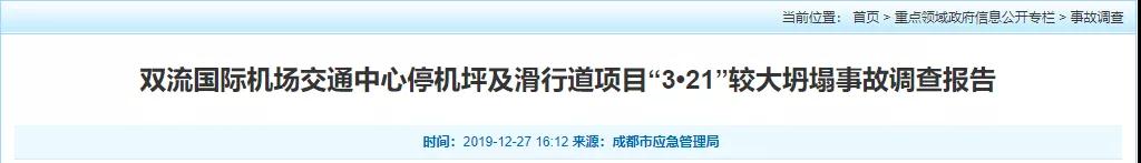 經(jīng)調(diào)查認(rèn)定,雙流國際機(jī)場交通中心停機(jī)坪及滑行道項(xiàng)目“3·21”坍塌事故是一起生產(chǎn)安全責(zé)任事故,事故等級為較大事故。