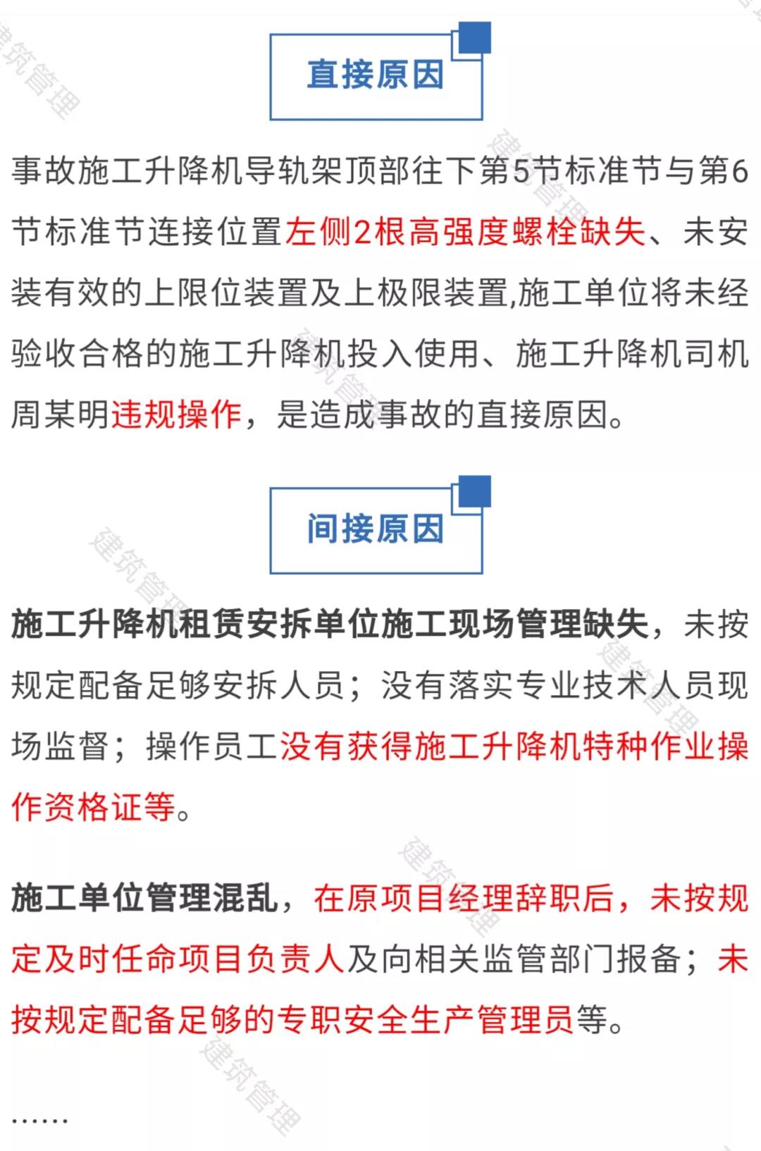 事故施工升降機(jī)導(dǎo)軌架頂部往下第5節(jié)標(biāo)準(zhǔn)節(jié)與第6節(jié)標(biāo)準(zhǔn)節(jié)連接位置左側(cè)2根高強(qiáng)度螺栓缺失、未安裝有效的上限位裝置及上極限裝置,廣東龍?jiān)浇ㄖこ逃邢薰緦⑽唇?jīng)驗(yàn)收合格的施工升降機(jī)投入使用、施工升降機(jī)司機(jī)周建明違規(guī)操作,是造成事故的直接原因。
