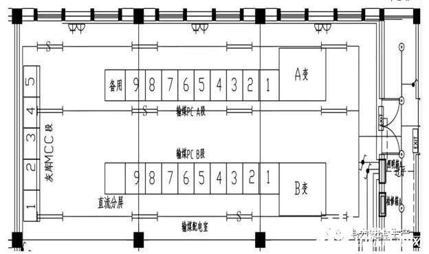 在輸煤配電室內,同時設計布置灰?guī)霢、B兩段MCC。兩段MCC各帶一個浪涌保護器,分別設置在兩段MCC進線開關側。400V灰?guī)霱CC開關柜為MNS型開關柜。灰?guī)斓裙孟到y(tǒng)的建設為A標段的工作內容,天津公司負責灰?guī)霱CC安裝,天津公司分包給中某建設實施。輸煤系統(tǒng)和灰?guī)祀娫唇泳€圖見圖一;配電室俯視示意圖見圖二。