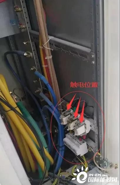 8月28日8點22分,王某帥(戴絕緣手套)完成本人負責的間隔電纜穿線并固定后,聽到隔壁柜發(fā)出聲響,檢查發(fā)現耿某坡(穿短袖上衣、未佩戴絕緣手套)身體倒進灰?guī)霢段MCC柜01間隔,右臂肘部及上臂與該柜浪涌保護熔斷式保險上插頭(裸露)三相搭接(現場照片見圖三)。王某帥立即通過拖拽耿某坡鞋子將其拉出間隔,并告知現場保安撥打120急救電話,同時進行不間斷心肺復蘇,通知本隊伍經理霍某平。