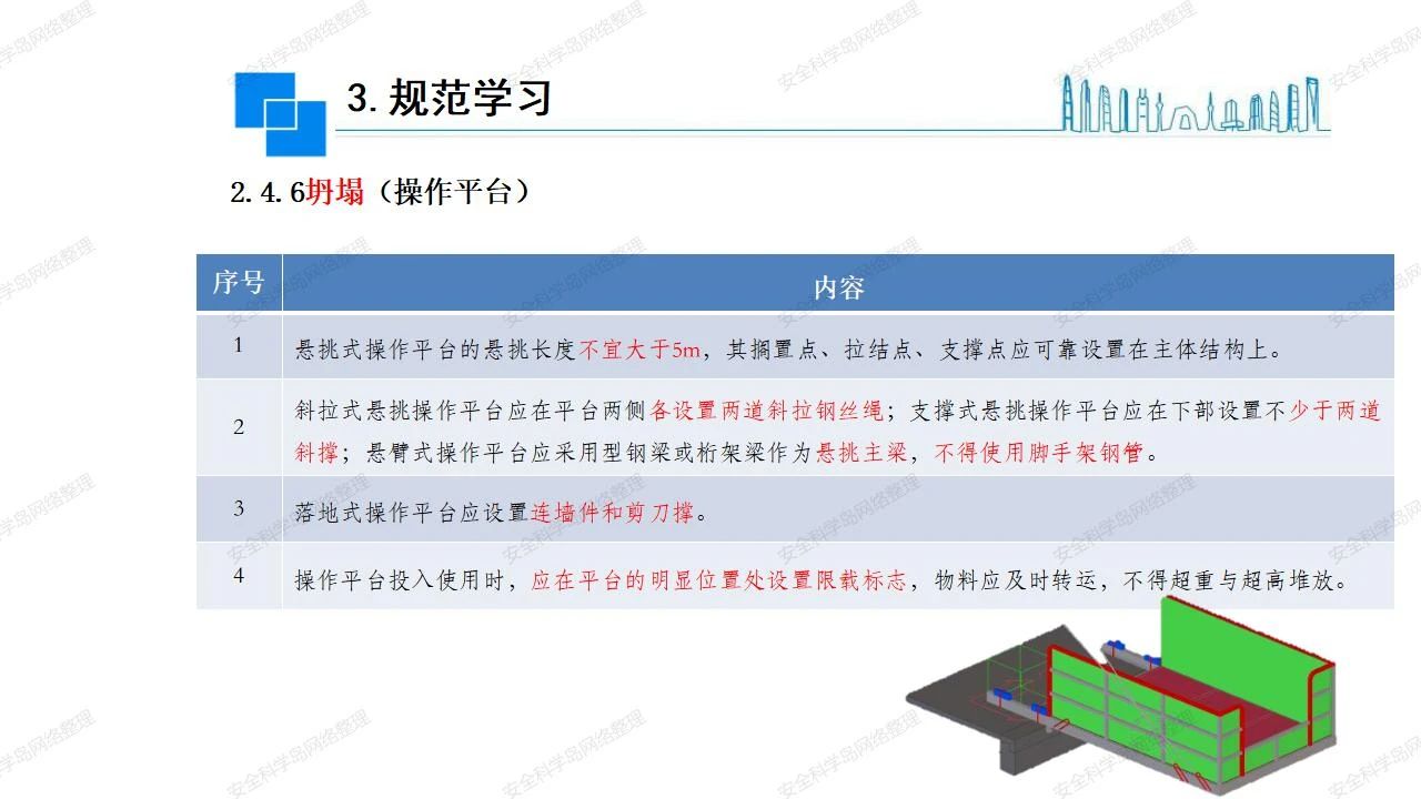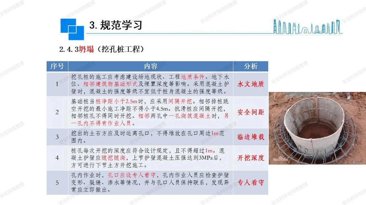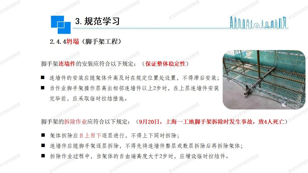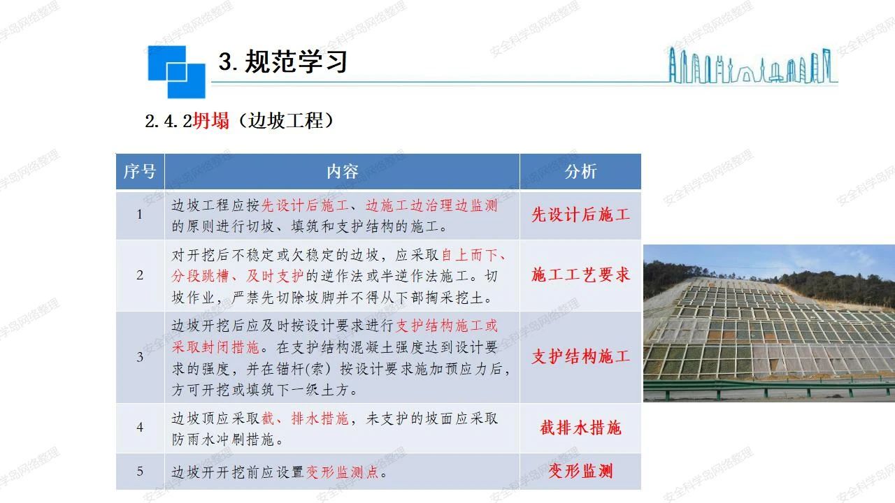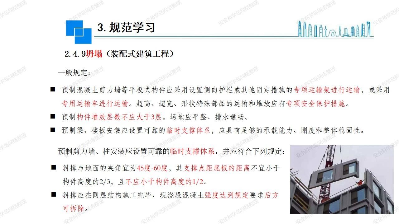 那么,坍塌事故發(fā)生的原因何在? (1)工程結(jié)構(gòu)設(shè)計(jì)不合理或計(jì)算失誤。 (2)施工前沒(méi)有編制切實(shí)可行的施工組織設(shè)計(jì)和專(zhuān)項(xiàng)施工方案,未做具體技術(shù)安全措施交底,特定施工項(xiàng)目未經(jīng)專(zhuān)家評(píng)審論證。 (3)腳手架、模板支撐、起重設(shè)備結(jié)構(gòu)設(shè)計(jì)不合理或計(jì)算失誤。 (4)建筑物結(jié)構(gòu)質(zhì)量低劣,安全性能差,地基不穩(wěn)定,不均勻沉降。 (5)建筑物結(jié)構(gòu)支撐連接(焊接)不牢固,超載、外力沖擊或嚴(yán)重偏心載荷造成失穩(wěn)等。 (6)腳手架及高大模板支架架體結(jié)構(gòu)不符合設(shè)計(jì)與規(guī)范要求,整體安全穩(wěn)定性差、超載或嚴(yán)重偏心荷載,遇外力沖擊或振動(dòng),不按程序拆除架體等因素造成失穩(wěn)等。 (7)基坑、土石方挖土?xí)r土壁不按規(guī)定留設(shè)邊坡(甚至負(fù)坡度),缺乏支護(hù)或支護(hù)不良,土質(zhì)不良或出現(xiàn)地下水、地表水的滲透,土壁經(jīng)不起重載側(cè)壓力或遇外力振動(dòng)、沖擊等因素造成土壁失穩(wěn)滑坡坍塌。 (8)起重設(shè)備技術(shù)安全性能差,結(jié)構(gòu)強(qiáng)度不夠,安全防護(hù)裝置不完善,垂直起重機(jī)與建筑物拉結(jié)差,出現(xiàn)超載、碰撞、升降過(guò)度或違章操作等原因,造成起重設(shè)備倒塌。 (9)現(xiàn)場(chǎng)作業(yè)環(huán)境不良,安全防護(hù)設(shè)施缺乏。 (10)施工現(xiàn)場(chǎng)管理松弛,各項(xiàng)質(zhì)量、安全管理制度流于形式。 (11)片面追求經(jīng)濟(jì)利益,偷工減料,施工質(zhì)量差。 (12)施工隊(duì)伍素質(zhì)差,不執(zhí)行法規(guī)、標(biāo)準(zhǔn),違章指揮、違章作業(yè),思想上存在盲目性、冒險(xiǎn)性、隨意性。 如何預(yù)防坍塌事故? (1)根據(jù)設(shè)計(jì)與規(guī)范要求,認(rèn)真編制施工組織設(shè)計(jì)和專(zhuān)項(xiàng)施工技術(shù)方案、應(yīng)急預(yù)案,做好特定施工項(xiàng)目專(zhuān)家評(píng)審論證及技術(shù)安全交底工作。 (2)支架、腳手架等搭設(shè)完成后應(yīng)組織相關(guān)部門(mén)驗(yàn)收。支架還應(yīng)按方案要求進(jìn)行堆載預(yù)壓。 (3)嚴(yán)格控制模板支架、腳手架等承受的荷載,模板、腳手架及其支撐體系的施工荷載應(yīng)做到均勻分布,并不得超過(guò)設(shè)計(jì)要求。嚴(yán)禁超載、對(duì)構(gòu)筑物進(jìn)行外力沖擊或偏心載荷。 (4)基坑、土石方挖土?xí)r土壁按規(guī)定留設(shè)邊坡,嚴(yán)格按照設(shè)計(jì)坡度進(jìn)行放坡開(kāi)挖,進(jìn)行有效支護(hù)和排水,并設(shè)置專(zhuān)人對(duì)邊坡穩(wěn)定性進(jìn)行檢測(cè)。基坑應(yīng)基坑頂邊緣1m范圍內(nèi)禁止堆放材料。 (5)加強(qiáng)起重設(shè)備的采購(gòu)管理,嚴(yán)禁使用不合格的起重設(shè)備,并定期進(jìn)行檢測(cè),確保各項(xiàng)性能和安全防護(hù)裝置良好;加強(qiáng)起重設(shè)備的安裝、拆除管理;加強(qiáng)起重設(shè)備的使用管理,嚴(yán)禁超載、碰撞或違章操作;加強(qiáng)對(duì)起重設(shè)備操作人員、指揮人員、安拆人員的安全教育培訓(xùn),考核合格后持證上崗。 (6)加強(qiáng)施工現(xiàn)場(chǎng)管理,設(shè)置有效安全防護(hù)設(shè)施。 (7)加強(qiáng)對(duì)從業(yè)人員的培訓(xùn)教育,提高隊(duì)伍素質(zhì),強(qiáng)化質(zhì)量、安全意識(shí)。 (8)強(qiáng)化工程質(zhì)量報(bào)驗(yàn)和檢驗(yàn)、簽證制度,不經(jīng)檢驗(yàn)合格,不準(zhǔn)進(jìn)行下道工序施工。 (9)發(fā)現(xiàn)坍塌事故的險(xiǎn)情,要認(rèn)真分析原因,積極研究提出排除隱患的整改措施,并監(jiān)督執(zhí)行。