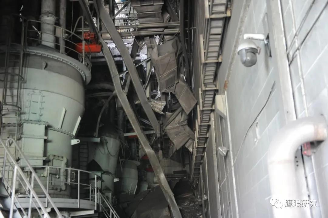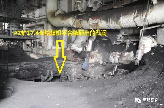 現(xiàn)場檢查,#2爐2D原煤倉下部錐體部脫落,砸壞2D給煤機(jī)平臺(tái),連同給煤機(jī)墜落至#2鍋爐零米,2D給煤機(jī)損壞、2C、2D磨煤機(jī)油站、2D磨煤機(jī)、給煤機(jī)附近區(qū)域電纜、輔汽聯(lián)箱管道等設(shè)備不同程度受損,無人員傷害及主設(shè)備損壞。(堵煤次數(shù)太多,敲塌了?)