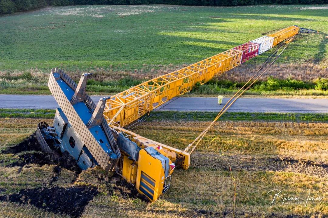 該風電場項目準備安裝 61 臺渦輪機,最大發(fā)電量為 219.6 兆瓦。該項目將覆蓋約 50,000 英畝土地。事故吊車屬于當?shù)匾患绎L能和太陽能公司,當時這輛800t履帶吊車正用于安裝風電機組,該風電機組通常位于雅芳北部和特里普西南部。當時疑似下方地面松軟,未進行吊裝前的勘察工作,負載過高造成大規(guī)模下陷,從而導(dǎo)致整車側(cè)翻。