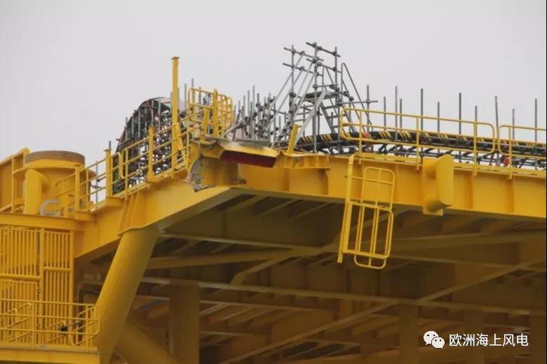 照片顯示導管架外表有凹痕,平臺電纜橋面的一個角落損壞。